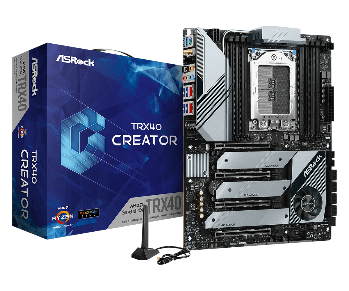 Asrock AMD 3rd Gen Ryzen Threadripper Motherboard The TRX40 Creator Features 10 Gigabit Aquantia Ethernet, 8 Phase Highperformance VRM, Quad Channel DDR4 Memory, Intel WiFi 6 and All new Realtek ALC4050H Premium Audio.